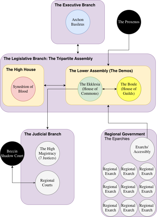 - The Ekklesia (Chamber of Commons): 112 representatives elected by geography. They manage civil liberties and social law. They possess the "Veto of Conscience," which allows them to pull on the heartstrings of tradition and philosophy. Most of the laws of the land are generated in this chamber, few are ever vetoed. This chamber also has the right to veto the other lower chamber, it has tried to do so far more often.